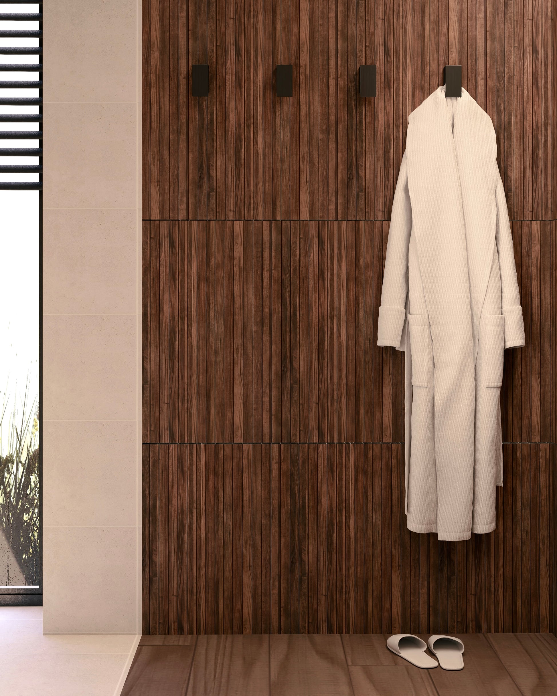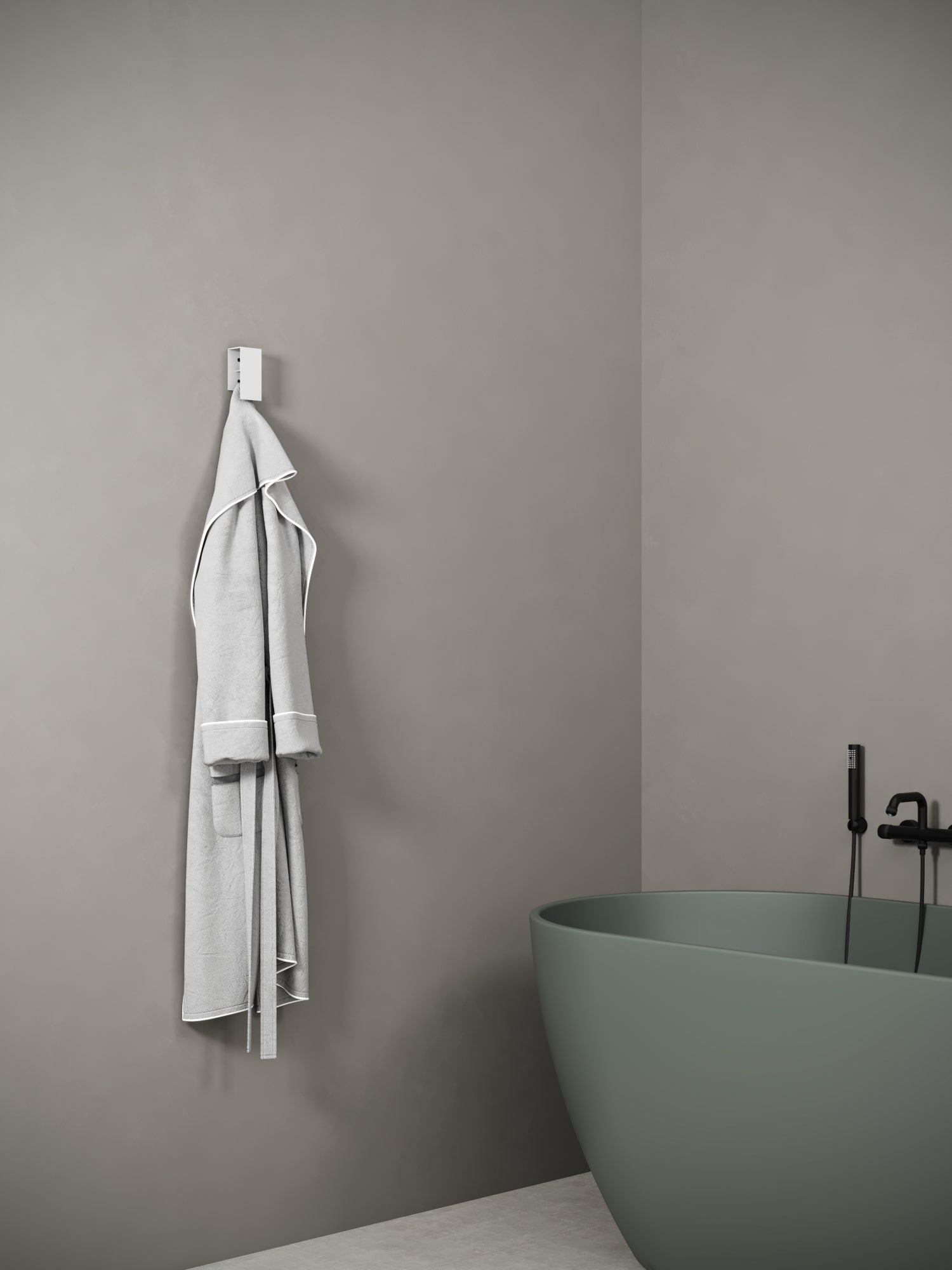 Ideale come appendi accappatoio o porta telo, si distingue per il suo design essenziale e contemporaneo, perfetto per completare spazi moderni con discrezione ed eleganza.