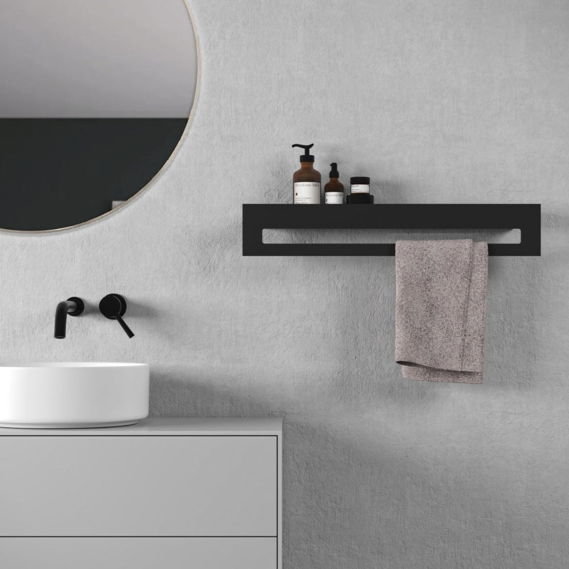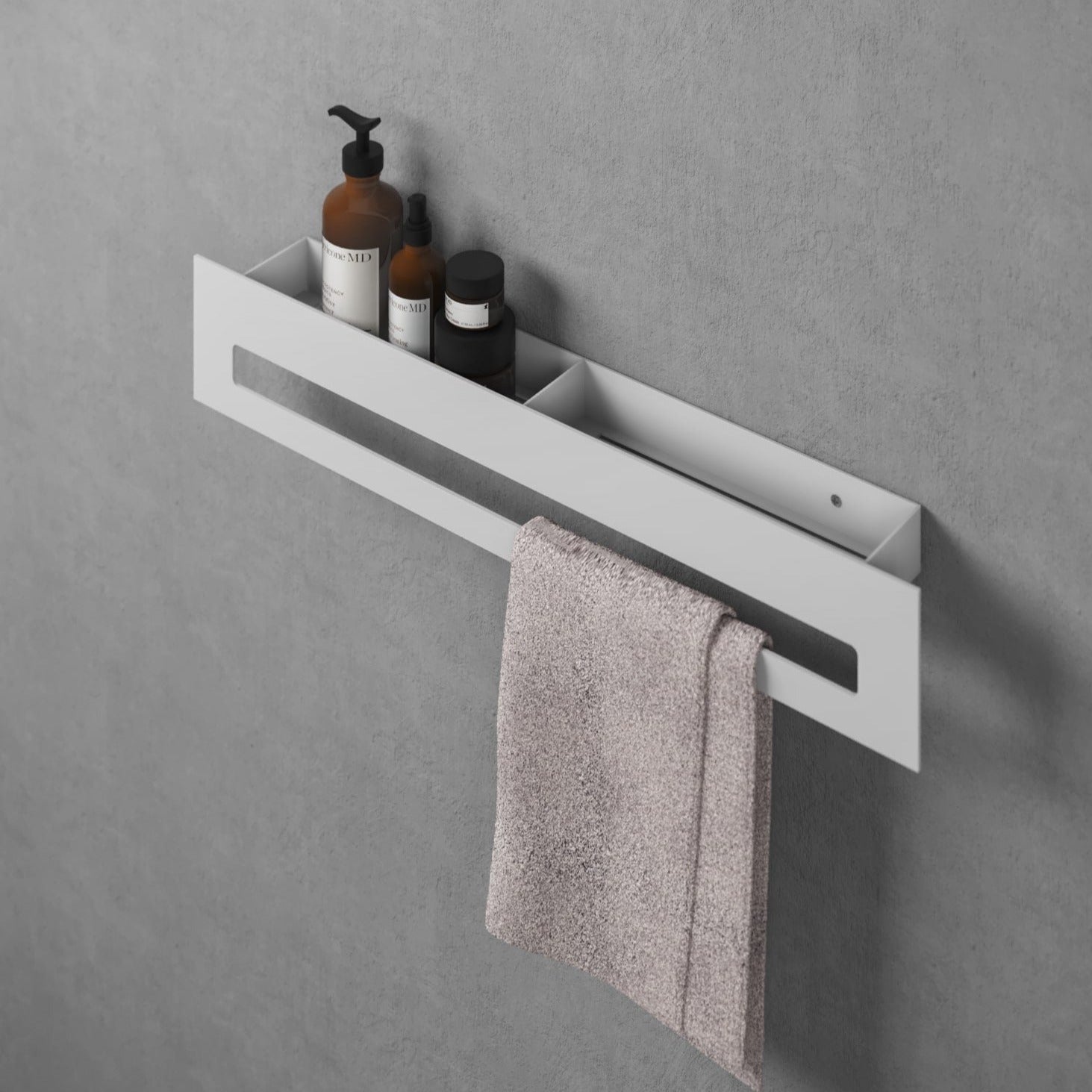 Installato a parete, Tokyo offre una doppia funzione: la parte inferiore consente di appendere comodamente un telo da bagno, mentre la parte superiore, dotata di vano porta oggetti forato, è ideale per riporre cosmetici, dispenser, profumatori per ambiente e piccoli accessori da bagno.